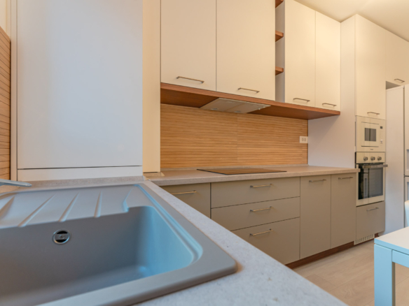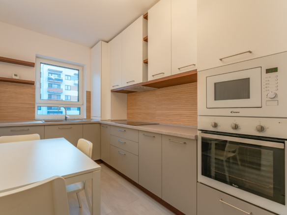 Apartamentul se închiriază complet mobilat și utilat, conform fotografiilor din prezentare. Dotările includ frigider, mașină de spălat vase, plită pe gaz, cuptor electric, hotă și mașină de spălat rufe. În plus, proprietatea beneficiază de un loc de parcare exterior inclus.