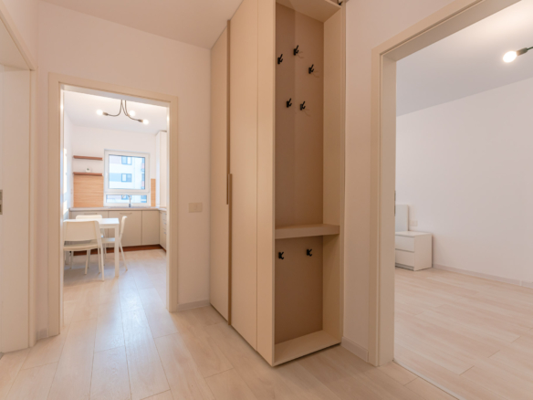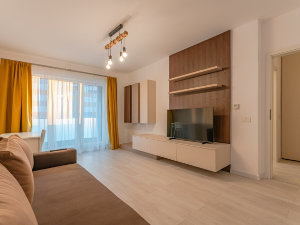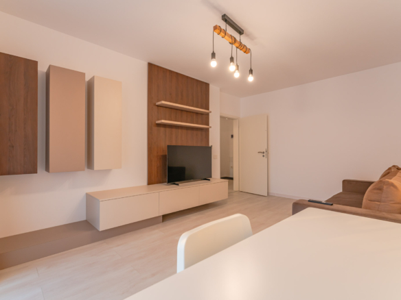 Vă propunem spre închiriere un apartament modern, situat în Brașov, zona Tractorul, în Ansamblul Rezidențial Maurer Villas. Locuința dispune de o compartimentare decomandată și este formată dintr-o cameră de zi, bucătărie, dormitor, baie, două balcoane și un hol de intrare, având o suprafață utilă de 55 mp la care se adaugă 7 mp de balcoane.