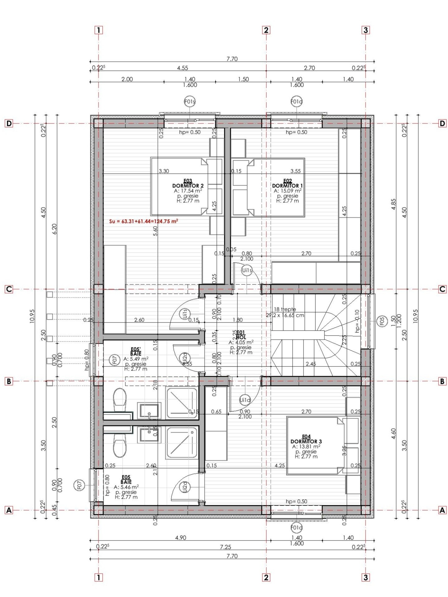Mansardă: Nivelul superior este dedicat odihnei și include un dormitor matrimonial dotat cu baie proprie, două dormitoare pentru copii cu acces la o a doua baie comună, hol și zona casei scării.