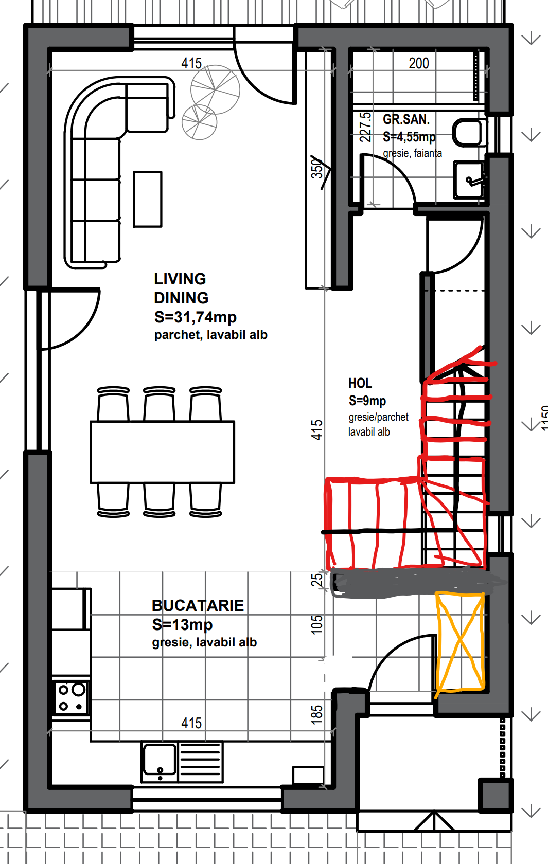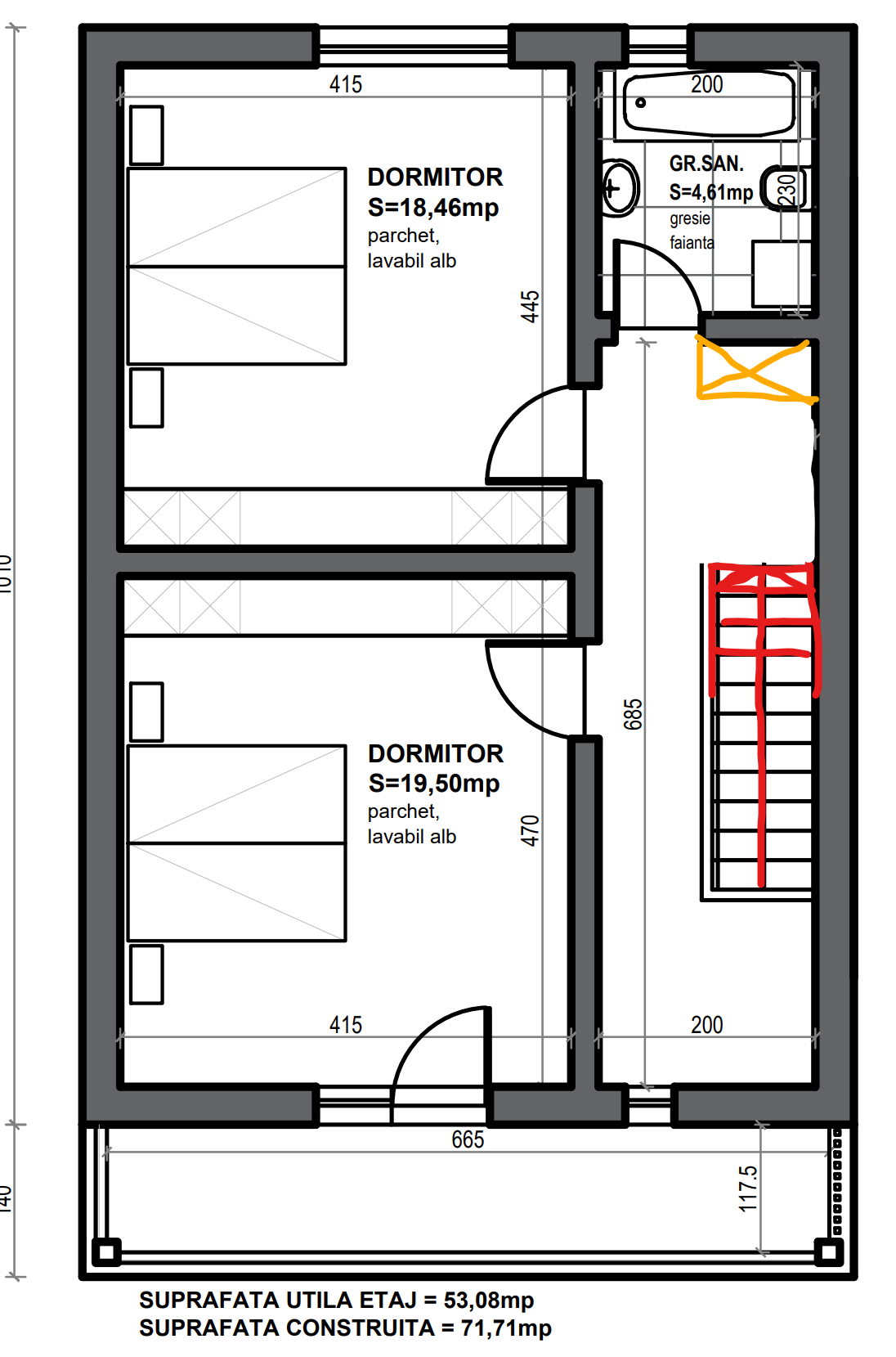 La parter veți găsi o cameră de zi, o zonă de luat masa, bucătărie open-space, terasă, baie, hol și casa scării. La mansardă sunt două dormitoare, baie, hol și balcon.